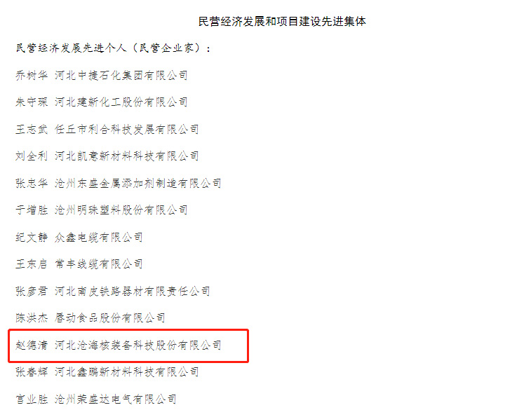 近日,河北滄海核裝備科技股份有限公司榮膺“2022年度滄州市民營經濟發(fā)展優(yōu) 秀企業(yè)”榮譽稱號,董事長趙德清獲民營經濟發(fā)展先 進個人稱號。